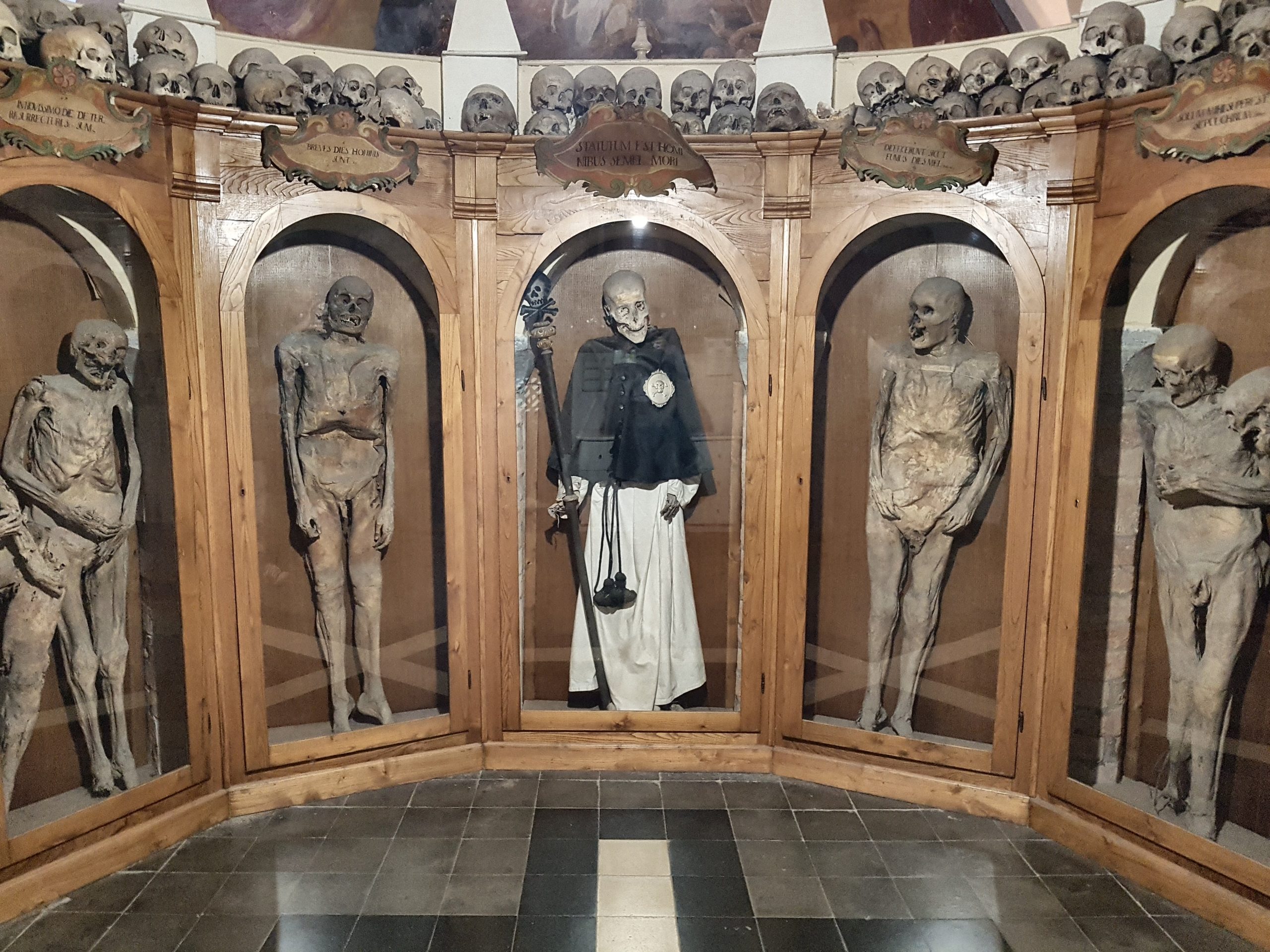 Le teche contenenti i corpi sono sormontate da scritte in latino che ci parlano della caducità della vita e della vanità dei piaceri della carne. Ciò che dovrebbe attirare l’interesse di uno spettatore attento, però, è il fatto che il significato moraleggiante delle scritte -ciò che si legge in alto-, contrasta con ciò che si vede in basso: alla luce di un macabro lampadario composto da ossa umane, realizzato in epoca più tarda, ciò che si può osservare non sono dei semplici cadaveri -con cui noi vivi siamo chiamati a confrontarci ed a differenziarci-, sono delle mummie, cioè dei cadaveri che son riusciti, almeno in parte ad ingannare il tempo, a rallentare la caducità delle carni.