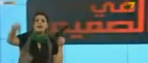 Sarà su due di queste immagini che mi soffermerò a riflettere, nella speranza di riuscire ad evidenziarne alcuni caratteri di interesse. Si tratta delle immagini di due donne: la prima raffigura una giornalista della televisione libica che, brandendo una pistola, si dichiara pronta al martirio in nome del rais; la seconda immagine – trasmessa durante il messaggio rivolto da Gheddafi alla nazione per spronarla alla lotta contro i ribelli accusati di essere dei “traditori” – raffigura una donna nell’atto di baciare un’effige del colonnello [1].